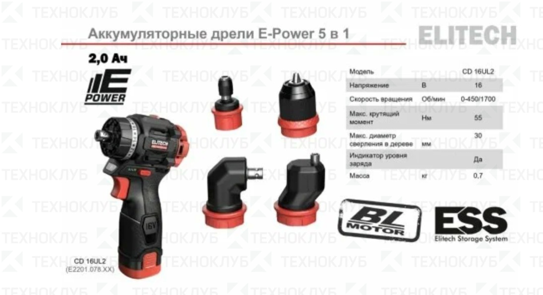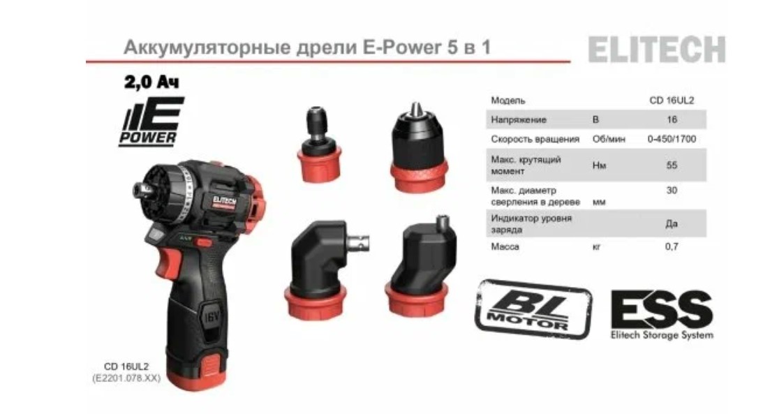 Дрель аккум. Elitech HD CD 16UL2 комби 16 В 2*2,0 Ач + 3 насадки