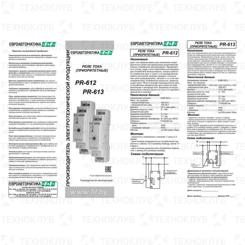 Реле контроля тока PR-613 1Z 16A, сквозн.канал F&F